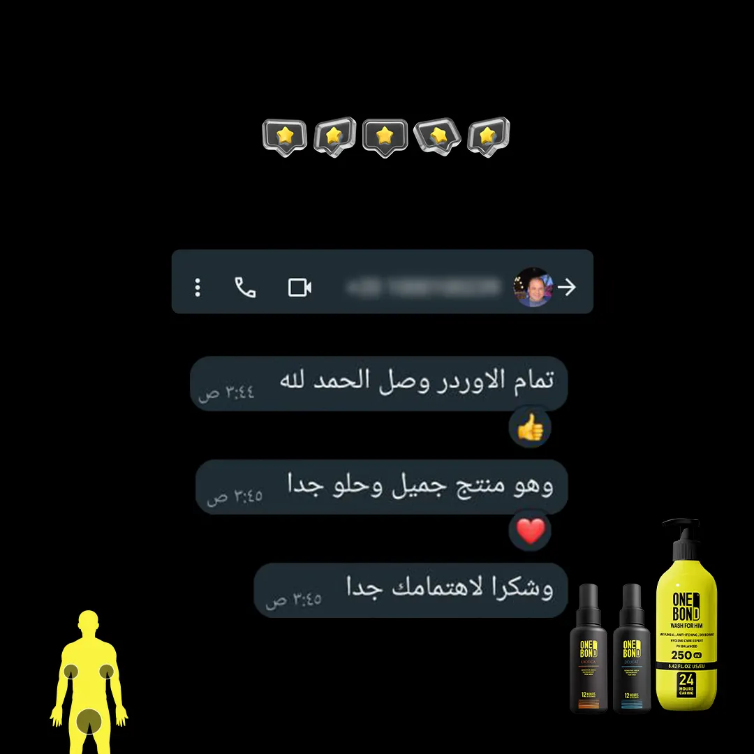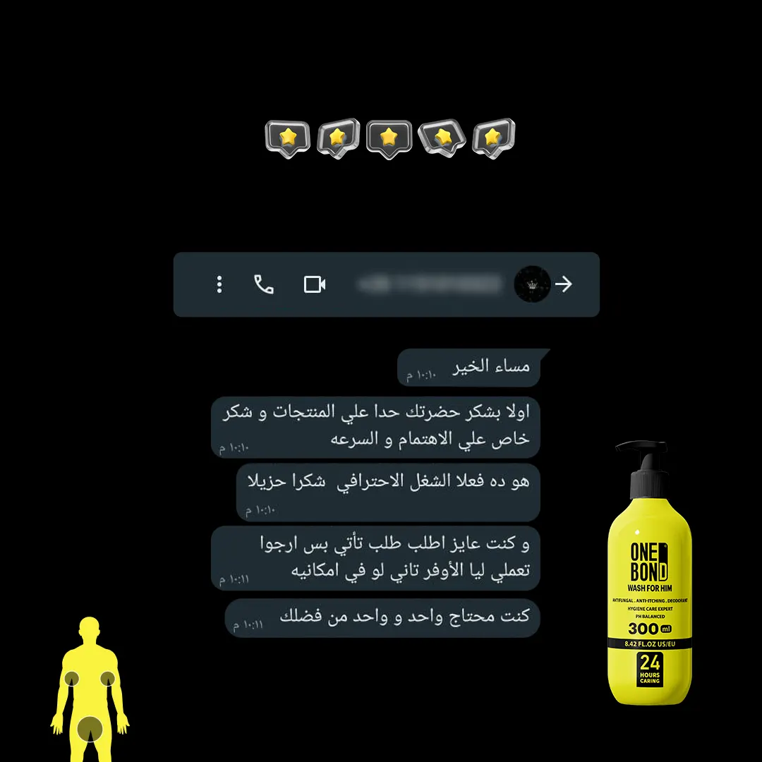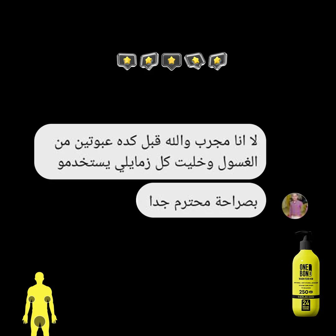 الصابون والشاور جيل مليان مواد كيمائية كاوية للبشرة ومضِّر جداً للمناطق الحساسة غسول ONE BOND وان بوند أول غسول رجالي للمناطق الحساسة للرجال بديل الصابون والشاور جيل يقضي على الفطريات والبكتيريا الضارة لانه يحافظ على الـ Ph المناسبة للمنطقة الحساسة يقضي على الالتهابات والتسلخات ويمنع العرق والروائح الكريهة ويمنع الأحساس بالحكة و الهرش ويحمي البشرة من الجفاف ويرطبها جيدا.